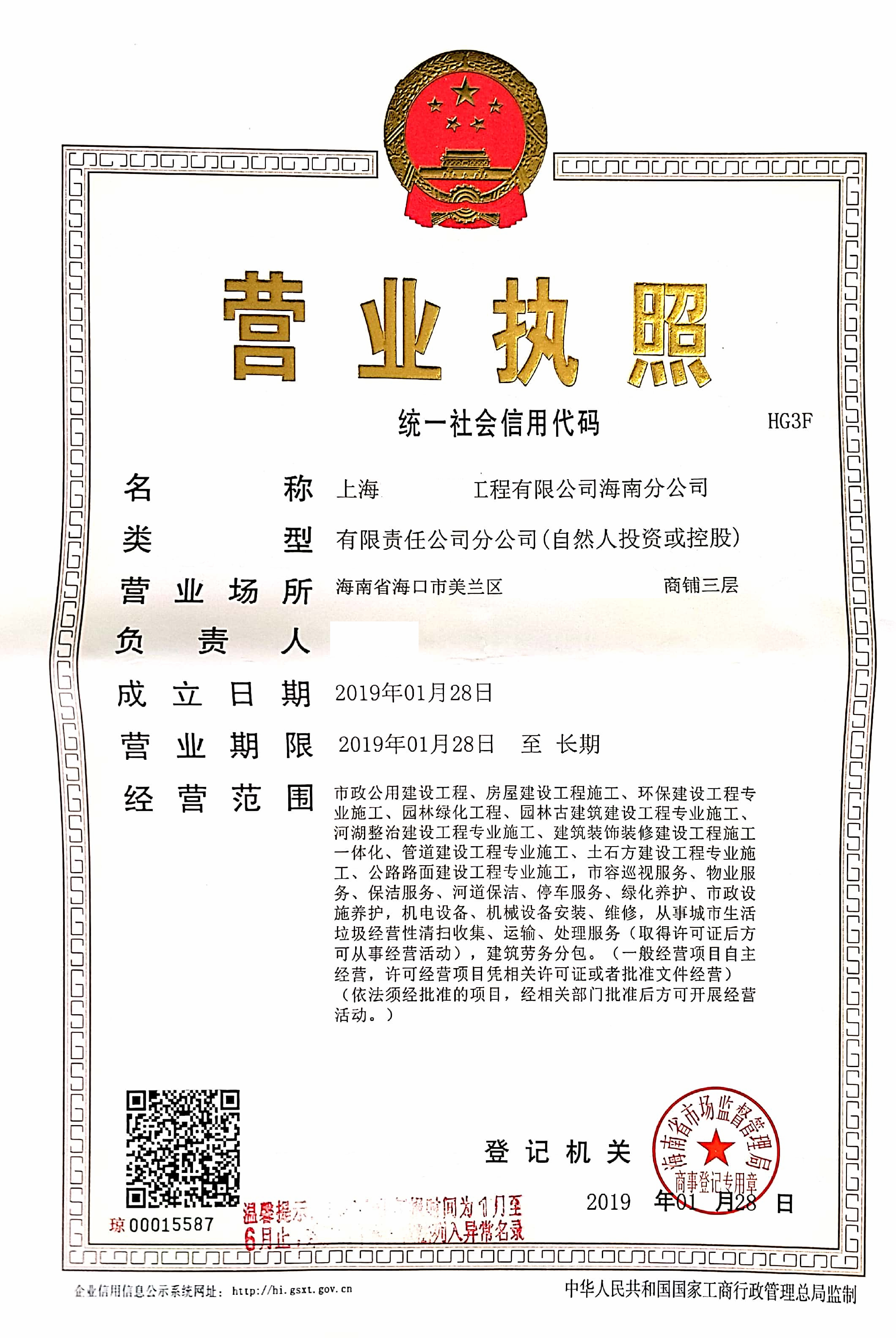 在2019年1月23日,上??蛻粑炭傉谌齺喅霾?,出差的同時(shí)也考察并了解海南市場(chǎng),認(rèn)為在海南有更多的機(jī)會(huì),因此通過(guò)網(wǎng)上找到海南登尼特,從三亞乘坐動(dòng)車趕到海口,委托海南登尼特協(xié)助注冊(cè)上?!痢两ㄔO(shè)工程有限公司海南分公司,再?gòu)暮?陲w回上海,并告知我們把海南分公司注冊(cè)好后再協(xié)助他注冊(cè)一家海南××保安公司。